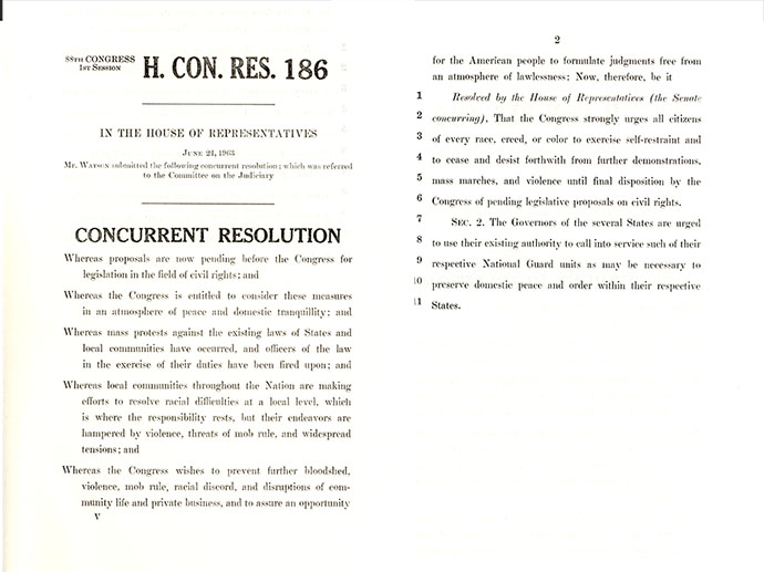 Representative Albert Watson (D-SC) introduced this concurrent resolution in the House on the same day that the Civil Rights bill was introduced. If passed, the resolution would have acted as an official call for the cessation of all demonstrations while Congress debated the Civil Rights bill. The resolution was referred to the Judiciary Committee, where it was never reported on.