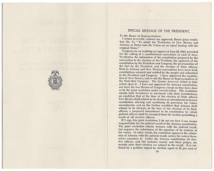 On August 15, 1911, President William Howard Taft vetoed the statehood resolution in large part because Arizona's constitution allowed for the recall of judges, a provision that he stated went against the need for an independent judiciary.