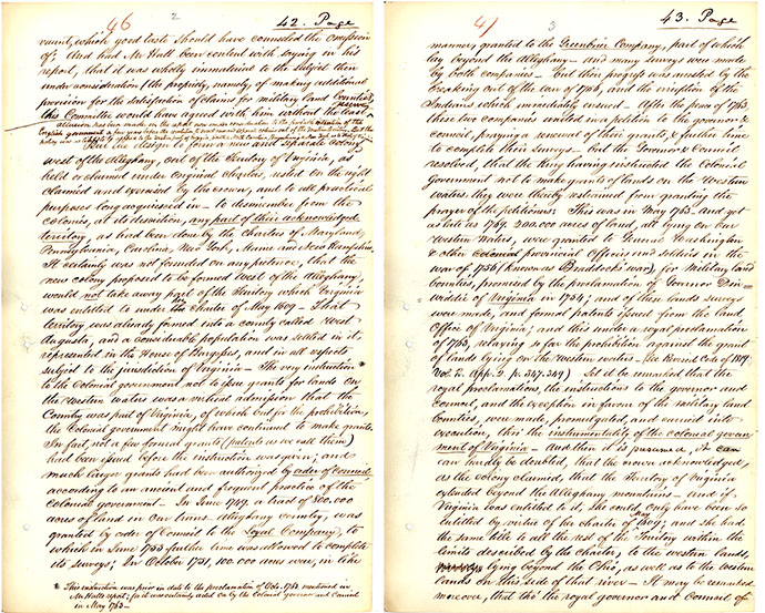 This 1844 report from the House Committee on Public Lands illustrates the complex border disputes of Virginia, dating back to the 17th century. The report states that the second royal charter (1609) granted Virginians a vast expanse of land that would later be carved up into “Maryland, Pennsylvania, Carolina, New York, Maine, and New Hampshire.” It also chronicles a period prior the the Revolutionary War where an attempt was made to form a new state "west of the Alleghany."