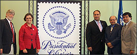 Richard Nixon Library and Birthplace Officials unveil the new stamp in the Nixon Library s replica of the White House East Room. Left to Right: Eduardo H. Ruiz, Jr. (District Manager; Santa Ana District, USPS), Michael D. Duvall (Yorba Linda Mayor Pro-Tem), U.S. Congressman Gary Miller (R-CA), William T. Johnstone (Secretary, Board of Governors, USPS), John H. Taylor (Nixon Foundation Executive Director) [Photo Credit: Paul Hiffmeyer]