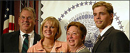 Franklin D. Roosevelt Presidential Library and Museum David Roosevelt (Grandson of President Franklin D. Roosevelt), Cynthia Koch (Director of the Franklin D. Roosevelt Library) Congressman John Sweeney, Nicholas Barrance (USPS), and David Solomon (USPS). [Photo Credit: Clifford Laube]