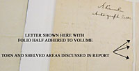 The investigation revealed that at one time the letter was part of the General Records of the Department of Treasury, series 82 “Letters Received from Executive Officers, 1831-1869”. These included 141 volumes in which original letters were bound. According to the index to Volume 91, the letter should have been on page five. Upon examination of page five, it was discovered that only half of the page remained pasted into the volume---it included a one sentence summary of the letter, the date, and the author of the letter. The body of the letter was missing.