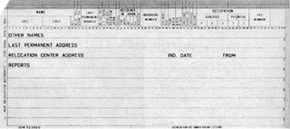 Data from War Relocation Authority Form 26: Evacuee Summary Data ("Locator Index"). The Evacuee Summary Data data file contains information about Japanese Americans interned in 10 camps during World War II by the War Relocation Authority (WRA). The original information was collected on WRA Form 26, coded by employees of the WRA, and keypunched by the agency. Apparently, two sets of punch cards were created: one set is in the custody of the National Archives, and the second was deposited at the Bancroft Library of the University of California at Berkeley following the termination of the WRA.6 The punch cards in the possession of the National Archives are apparently the original set produced by the WRA.7 Those punch cards were manually annotated by the WRA during the period of the camps, with information about internees' aliases, date of departure and place of destination, and other uncoded information. The punch cards deposited at Berkeley did not contain such additional information and were a basic machine copy of the "original" punch cards that were transferred to and remain in the custody of the U.S. government at the National Archives.8 In general, the Bancroft Library is the repository for those WRA records not accessioned by the National Archives.