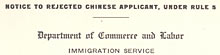 Charles Meehan, inspector-in-charge of the Immigration Service's Chinese Division, immediately informed Quok Shee that she had been refused admission: a form letter was drawn up and read to her through interpreter Chin Jack. The next day, Commissioner White wrote to both Quok Shee and the Chinese consul general, informing them that her application to land had been denied. The brisk "Notice to Rejected Chinese Applicant, Under Rule 5" was thoughtfully printed in both English and Chinese. Quok Shee was advised that she had two days to launch an appeal.