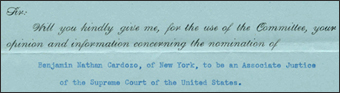 - Frank Porter, Brooklyn, New York, to the Senate Committee on the Judiciary, February 18, 1932; Benjamin Nathan Cardozo File; Papers re Nominations [SEN 72B-A3]; 72nd Congress.