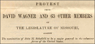 - Petition from members of the General Assembly of Missouri to the U.S. Senate, December 1863; John M. Schofield File; Papers re Nominations [SEN 38B-A4]; 38th Congress.