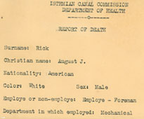 Deaths were common in the Panama Canal Zone due to work-related injuries and diseases. According to the probate case file, In the Matter of the Estate of August J. Rick, from the First Judicial Circuit, Rick died on April 10, 1907, in the Ancon Hospital. Although his entire possessions fit into one steamer trunk, the file is fairly extensive. The full inventory of goods and chattels lists 1 razor; 4 pearl buttons; one slipper, straw; 11 shirts, 2 undershirts; 2 pairs of drawers; and other items. The file also contains an Isthmian Canal Commission Department of Health's Report of Death that lists the following facts about Rick: American; foreman in Mechanical Department; lived in the Panama Canal Zone for 12 months; 46 years old; a widower; and had a daughter named Mispal Rick who lived in Key West, Florida.