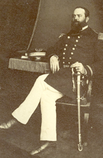 Original photographs of ancestors constitute one final and quite valuable type of document that occasionally turns up in private claims. The reasons photographs appear in these files, especially in the pension-related petitions, remain unclear, except perhaps to provide a human dimension to the claim. Two noteworthy examples in the Accompanying Papers involve the claims of Helen Harrell and Thomas N. McAfrey. In 1874 Helen O'Hara Harrell applied to Congress for a Navy pension following the death on December 16, 1871, of her husband, Capt. Abram Davis Harrell. Her lengthy and sometimes dramatic petition recounted Harrell's naval career, his resulting service-related illnesses, and forced retirement at the close of the Civil War, which left the couple destitute at the time of his death. Affixed to the petition with a black ribbon, probably for added dramatic affect, Helen enclosed a photograph of Captain Harrell, taken in Naples, Italy, in 1859 while he was serving as first lieutenant on the USS Macedonian, the flagship of the U.S. Navy's Mediterranean Squadron. Somewhat ironically, the photograph featured a rather stout and healthy-looking naval officer bedecked in his finest uniform and presentation sword.24