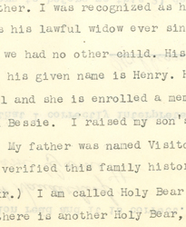 In the deposition dated May 21, 1923, Holy Bear, a member of the Oglala Sioux tribe, states that, "My age is 72 or 73 years." She claims that she is the widow of Little Bull, and that they "were married according to our Indian custom" prior to his service as an Indian Scout. She was also with him when he died during the spring or summer of 1879. Holy Bear also provides information about her family. Her father’s name was Visitor, and her mother was Hornet. She had a son with Little Bull named Harry (Henry) Little Bull and was raising his daughter Bessie since the death of her mother. She also points out that she is called Holy Bear No. 2 on the agency records because there is another woman with that name who also has a land allotment. In addition to Holy Bear’s testimony, other depositions in the file also provide great genealogical information.