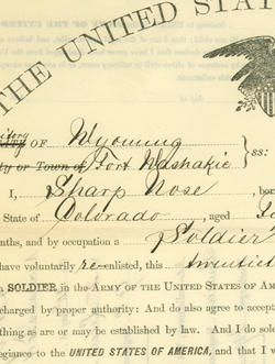 A good example of a scout with multiple enlistments is Sharp Nose, an Arapahoe chief, who has 20 numbered enlistment papers listed in the Northern Indian Scout Index. His first enlistment paper, in which he enlisted for three months, is dated October 27, 1876. His last enlistment paper, for a six–month enlistment, is dated May 20, 1890.