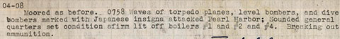 4 to 8: Moored as before. 0621 YG-17 came alongside to port. . . . [lists men leaving ship for shore patrol] . . . 0750 Japanese planes without warning attacked units of the United States Fleet and U.S. Naval Air Station, Ford Island. Sounded General Quarters and manned Battle Stations.