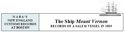 After its first voyage, the Ship Mount Vernon continued a similar pattern, usually making one trip each year until 1812, when it disappears from the records of the Salem Collector of Customs. There is also no record of it for 1807. It is possible that the Mount Vernon spent that year abroad, as some Salem ships did, when an embargo was declared prohibiting all foreign trade.