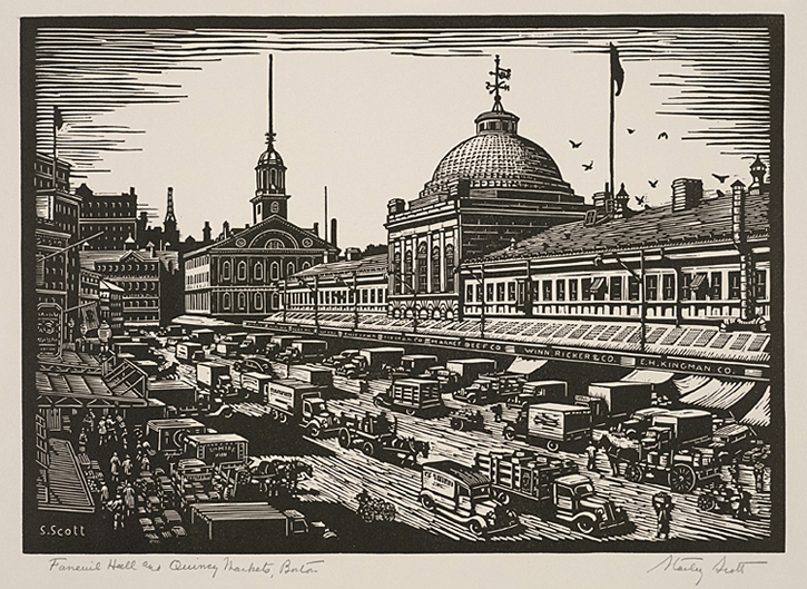 Created under the Federal Art Project of the Works Progress Administration by Stanley Scott, this linocut shows Faneuil Hall and Quincy Market in Boston in the 1930s. Faneuil Hall has been a marketplace and a meeting hall since 1742. It was and still is the site of political meetings, notably speeches by Samuel Adams, James Otis, and others encouraging independence. Quincy market was constructed as an indoor pavillion in 18241826 and named in honor of Mayor Josiah Quincy (a relative of Abigail Adams), who organized its construction without any tax or debt. Boston still looks just like this, except that now the cars aren't allowed there.