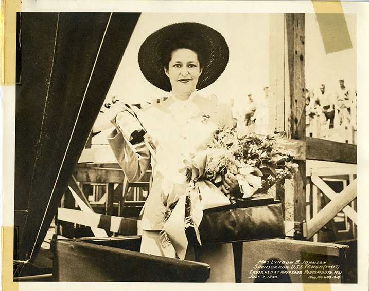 On July 7, 1944, future first lady and wife of Texas Congressman Lyndon Johnson launched the submarine U.S.S. Trench at the Portsmouth Navy Yard in Portsmouth, New Hampshire. Record Group 181: Records of Naval Districts and Shore Establishments, 1784 - 2000, Correspondence Concerning Ships, 1937 - 1954, Mrs. Lyndon B. Johnson, Sponsor for USS Tench (SS 417) Launch, 07/07/1944, National Archives Identifier: 7431685.
