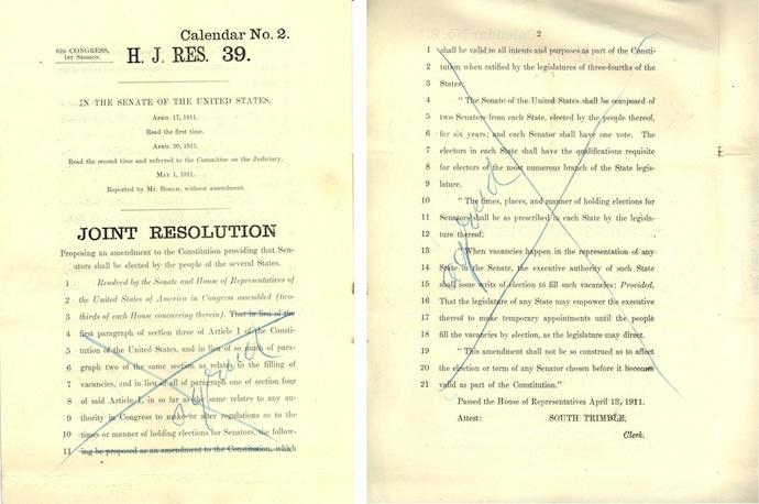 House Joint Resolution 39 ultimately passed both houses of Congress and became the 17th Amendment. However, this version of the resolution as it originally passed the House of Representatives contained language referred to as the “race rider.” The clause states, “The times, places, and manner of holding elections for Senators shall be as prescribed in each State by the legislature thereof.” This language was meant to bar Federal intervention in cases of racial discrimination among voters. This would be done by vesting complete control of Senate elections in state governments. A substitute amendment by Senator Joseph L. Bristow (R-KS) provided for the direct election of Senators without the "race rider." Bristow’s version later passed both houses of Congress and was ratified by the states.