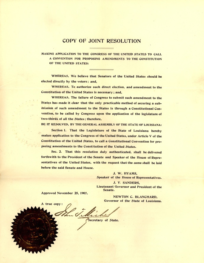 This application from the governor and state legislature of Louisiana for a constitutional convention specifically cites Congress’s failure to propose an amendment for direct election. Louisiana was one of many states that hoped that the never used convention method of proposing constitutional amendments would enable them to successfully bypass the reluctant Congress.