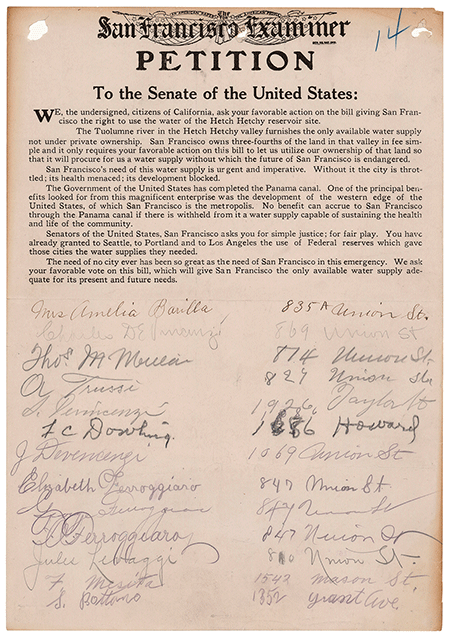 In this petition, hundreds of California residents urged Congress to pass the Raker Bill, a bill to grant San Francisco the right to dam the Hetch Hetchy Valley. Written and distributed by the San Francisco Examiner, this petition stressed to Congress that San Francisco's need for water was urgent and that the Hetch Hetchy Valley was the only available water source not under private control. The paper, owned by William Randolph Hearst, published regular pieces in support of the Raker Bill.