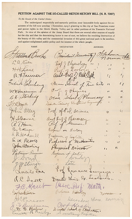 In 1913, over a dozen professors from the University of Oklahoma signed this petition, which urged Congress to vote against the Raker Bill, a bill to grant San Francisco the right to dam the Hetch Hetchy Valley. These educators encouraged Congress to consider the interest of the whole country before unnecessarily invading the Valley. The University President, Stratton D. Brooks, was the first to sign the petition, followed by various professors and deans. Hundreds of university administrators and professors, from such schools as Harvard and Columbia, signed identical petitions that urged Congress to defeat the Raker Bill.
