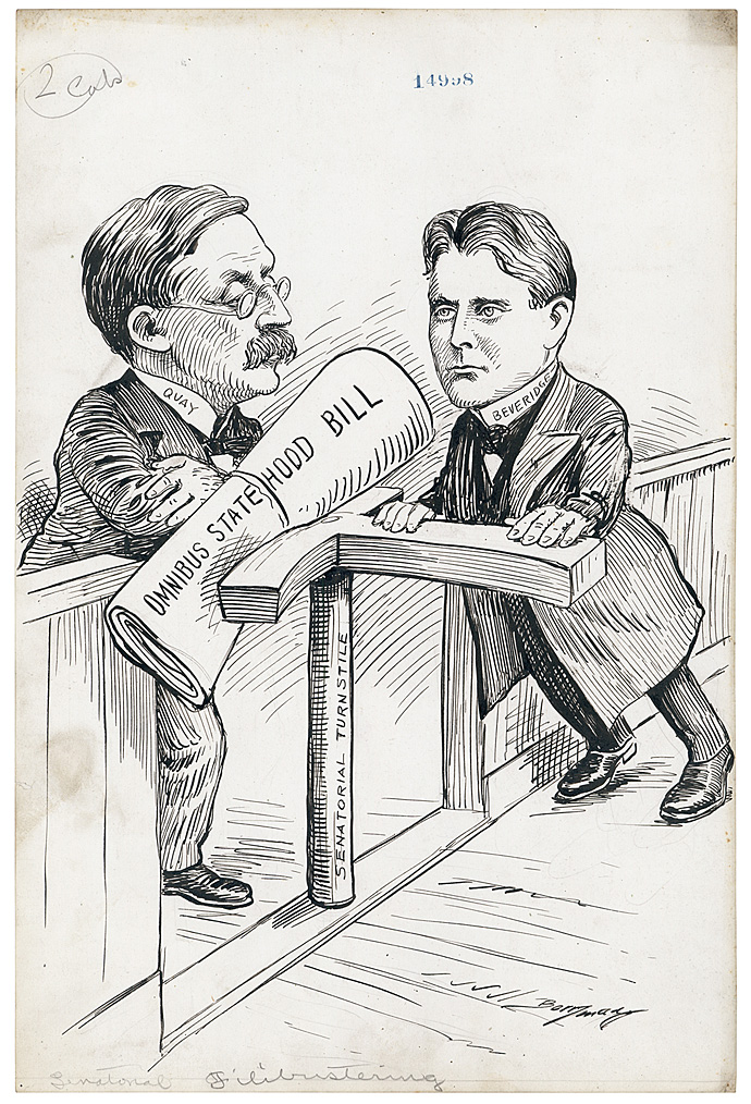 During the late 19th Century various members of Congress introduced bills in support of Arizona and New Mexico statehood, but none were approved. In 1903 the Senate Committee on Territories reported a bill to enable Oklahoma, Arizona and New Mexico to be admitted into the Union. Senator Matthew S. Quay (R-PA) pushed to pass this Omnibus Statehood Bill but was blocked by Senator Albert J. Beveridge (R-IN) in the "Senatorial turnstile."
