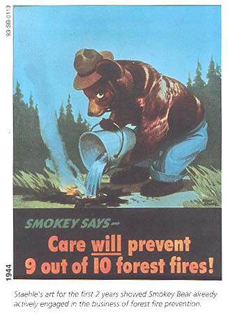 Staehle s art for the first 2 years showed Smokey Bear already actively engaged in the business of forest fire prevention. (1944)