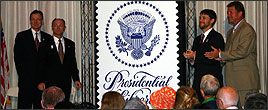 Richard Nixon Library and Birthplace Officials unveil the new stamp in the Nixon Library s replica of the White House East Room. Left to Right: Eduardo H. Ruiz, Jr. (District Manager; Santa Ana District, USPS), Michael D. Duvall (Yorba Linda Mayor Pro-Tem), U.S. Congressman Gary Miller (R-CA), William T. Johnstone (Secretary, Board of Governors, USPS), John H. Taylor (Nixon Foundation Executive Director) [Photo Credit: Paul Hiffmeyer]