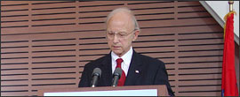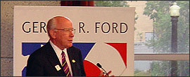 Gerald R. Ford Presidential Library and Museum U.S. Representative Vernon J. Ehlers addresses the audience at the stamp ceremony at the Gerald R. Ford Museum in Grand Rapids, Michigan. [Photo Credit: James Draper]