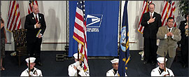Ronald Reagan Presidential Library and Museum Color Guard (Naval Base Ventura County Military Ceremonial Unit) at the Ronald Reagan Library. National Anthem performed by Peter Santana (Letter Carrier, Sherman Oaks Post Office), Duke Blackwood (Director), and to the left of the Official dedication, The Honorable James C. Miller III (Chairman, Board of Governors, USPS). [Photo Credit: Barbara Kurata]
