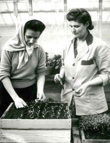 These problems notwithstanding, the list of WLA accomplishments for 1944 is quite long. Approximately 175 Smith College students worked throughout the summer on New England farms. Nearly two hundred Sweetbriar College students promptly responded to a call to help save Virginia's apple crop. In one county in Oregon, five hundred homemakers were credited with saving the state's bean crop. They boarded the "Housewives' Special" each day at 8:30 a.m., worked until mid afternoon, and returned home at 3 p.m. in time to market and prepare supper. Women drove trucks to grain elevators in the Midwest, chopped cotton in the South, organized a central harvest agency in Oklahoma where farmers could telephone their labor needs which were then broadcast over the local radio, hoed potatoes in Colorado, and established community canning centers across the nation. In all, 774,000 nonfarm women were placed in farm jobs during 1944.60