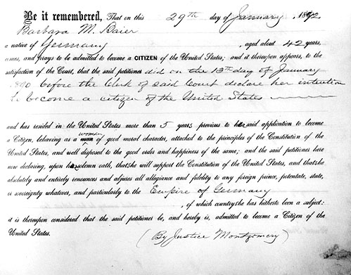 The fact that women are not equally represented among the nation's early naturalization records often surprises researchers. Those who assume naturalization practice and procedure have always been as they are today may spend valuable time searching for a nonexistent record. At the same time, many genealogists do find naturalization records for women. The resulting confusion about this subject generates a demand for clear, simple instructions by which to guide research. Unfortunately, the only rule one can apply to all U.S. naturalization records--certainly all those prior to September 1906--is that there was no rule.(1)