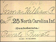 In Record Group 109, War Department Collection of Confederate Records, there is a compiled military service record for a Pvt. William P. Inman who served in Company F, Twenty-fifth North Carolina Infantry Regiment. The first card provides some personal information. His physical description is listed as five feet, seven inches tall with dark hair and a fair complexion. Inman, from Haywood County, North Carolina, was twenty-two years old at the time of his enlistment. He enrolled for duty with Capt. Thomas I. Lenoir's Company of the Twenty-fifth North Carolina State Troops in Haywood County on June 29, 1861. The unit mustered into state service on July 20. Later, Lenoir's company was changed to Company F of the Twenty-fifth North Carolina Infantry Regiment and entered into Confederate service on October 22, 1861, at Camp Davis, near Wilmington, North Carolina.