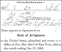In very rare cases, additional information can be gleaned from related documents highlighted in the compiled military service record. Inman's service record card notes that he signed an oath of allegiance in the office of the Provost Marshal General of East Tennessee in December 1864, but the place where he swore the oath is not listed. A search through several series in Record Group 109 failed to turn up any listing for oaths of allegiance filed under "East Tennessee." The volumes in Entry 204 that record oaths of allegiance, however, reveal that Inman signed his oath in Knoxville, Tennessee, in the office of Brigadier General Carter. The provost marshal turns out to be Brig. Gen. Samuel Powhatan Carter, notable for being the only officer to attain the rank of major general in the U.S. Army and rear admiral in the U.S. Navy. Carter's cover letter to the War Department transmitting the list of "rebel deserters" who took the oath in his office in December 1864 is found in Record Group 249, Records of the Commissary General of Prisoners.
