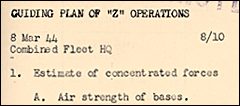 Once at Palau, Koga and his staff refined the Z Plan, issuing a final draft version to the fleet on March 8 (Combined Fleet Secret Operations Order No. 73). It would commit all remaining Japanese naval power to one last major battle. Two weeks later, Koga's staff produced a paper entitled "A Study of the Main Features of Decisive Air Operations in the Central Pacific." It suggested aerial tactics that might be used during the decisive battle to counter the American naval offensive and destroy the U.S. Pacific Fleet. It was detailed and meticulous, spelling out current status and projected strength, plus where Japanese surface and air strength was to be deployed by the end of April. Koga expected the Americans to show up in strength any time after the first of April. He believed that once the American fleet broke into the Philippine Sea, by way of the Marianas or the Palau Islands or New Guinea, the Japanese Combined Fleet would meet them in full strength. He then set about consolidating the bulk of his forces, obtaining more airplanes, and training replacement pilots.
