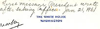 By far the largest amount of material recovered were thousands of pages of documents from President Kennedy and his staff documenting the official business of the White House as well as important files from his years as a U.S. senator. There also are some personal accounts and bills belonging to the President and the First Lady and handwritten doodles by Kennedy, including the first message he wrote after taking office on January 21, 1961, planning the week's meeting schedule: "Monday—Rayburn + Johnson" "Tuesday 9:00 Legislative leaders" "Thurs or Fri—Cabinet" "Monday—Rusk + Bundy McNamara." There are also medical records consisting of correspondence, statements, an immunization record, prescriptions, and notes relating to Kennedy's health and medical care.