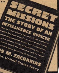 While on detail to OWI, Captain Zacharias submitted several lengthy reports and proposals, all designed to obtain a role for himself in the occupation of Japan. No action was taken. In addition, he made many public appearances as a representative of the Navy for the purposes of creating good will and to combat the current feeling that naval strength should be reduced and the armed services merged. He was commended by both the Navy (but probably not the Army) and public officials for his efforts. Otherwise frustrated and left with few remaining official duties, Zacharias used this postwar period to write his controversial autobiography, Secret Missions.