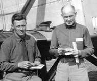 The first and second night they burned parts of their plane to stay warm, smoked tobacco, and alternated sleeping. The thick fog that had caused their crash now inhibited their rescue. By the third day, with no sign of the weather lifting and mindful of the risk of stumbling off a precipice in the fog, they started walking. Taking doses of their emergency liquid rations for energy—two tablespoons constituted a meal—they made their way down the mountain following a creek bed until, on May 6, they finally reached the ocean shore. Along the bay, they found an unoccupied cabin filled with hotcakes and other food. They recovered their strength and rested their eyes—both were heavily affected by snow blindness—and reconnoitered their position. On the tenth, they set out again. Later that afternoon, they were rescued.