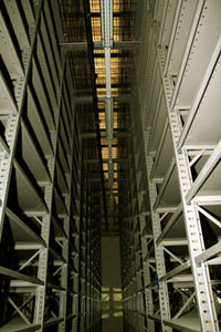 At the new building, nearly all the records storage units are 29 shelves high, compared to only 10 to 14 shelves high at the older buildings. The staff will gain access to the first 15 shelves by using rolling ladders on the floor level. Two levels of steel catwalk will provide access to the remaining shelves.