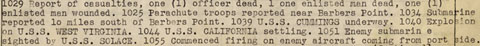 The logs also documented the confusion caused by the surprise attack, recording false reports and tense investigations of unidentified ships and sonar contacts. The USS Maryland received erroneous reports that a group of Japanese troops had parachuted into Barbers Point Naval Air Station and onto the North Shore of Oahu island. In this log, the crew even gave descriptions of the mysterious group, describing them as wearing blue overalls with red emblems.