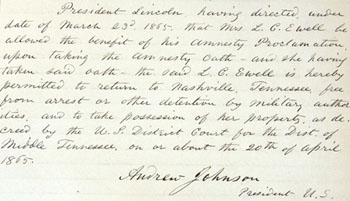 Whitman's proximity to Stanbery and President Andrew Johnson is seen dramatically in a letter reproduced here, a letter written entirely— including the signature "Andrew Johnson" —in Whitman's hand.