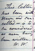 The Walt Whitman Archive will present high-quality color facsimile images of these documents, along with searchable transcriptions. The facsimile images are especially important since not more than a handful of these documents are signed or initialed by Whitman. One of the few documents that is initialed appears here. It is a July 14, 1868, letter in Whitman's hand having to do with pensions. A marginal note, also in Whitman's hand, says: "This letter has been withdrawn and cancelled—is to be considered as never having been written. W.W." The practice of canceling a document is straightforward. However, the phrasing here is curious, perhaps even nonsensical. How can one look at writing and regard it as never having been written?