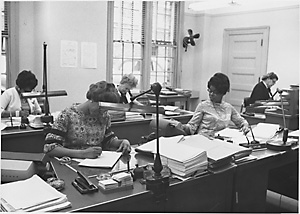 Copeland Family Story: Ethel Copeland (with adding machine) working in the Statistical Reporting Section of the U.S. Department of Agriculture,