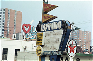 From 1974 Washington, D.C. suburbs coverage, accompanied by photographer's group caption: "Entire set of [slides from] Silver Spring, Maryland, where crass commercialization with no regard for beauty or even pleasant atmosphere prevails . . . This wanton profusion of free enterprise creates eye-sores not easily changed but unpleasant and depressing." Yoichi Okamoto,