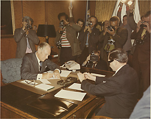 Secretary of State William Rogers signing the hijacking agreement with Cuba, Washington, D.C., 1973.