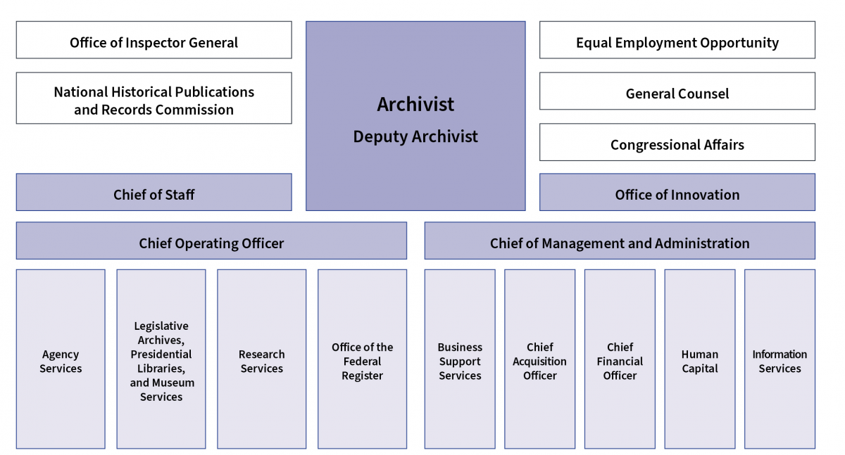NARA’s organizational structure focuses agency resources and management attention on delivering coordinated and effective services to key stakeholders and customers. NARA’s customer-focused organizations allow the agency to better engage its stakeholders, encourage their collaboration and participation, and respond to their needs expediently and efficiently. This structure eliminates duplication of processes and resources, creates a more flexible and agile organization, and promotes shared accountability for the performance of the agency as a whole.