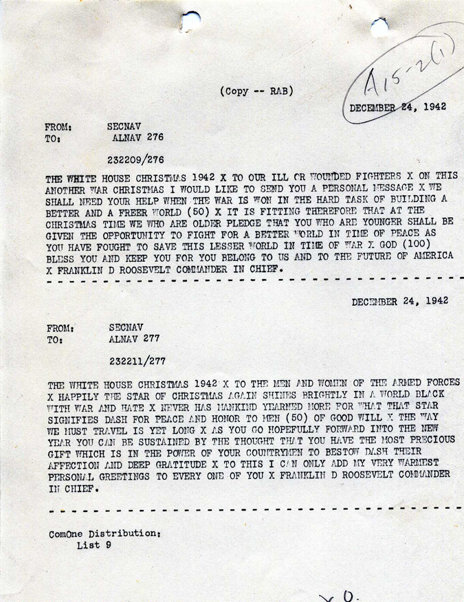 Remembering those in service to their country, December 24, 1942, President Roosevelt issued this proclamation via the Secretary of the Navy. Records of First Naval District, Boston Navy Yard, Record Group 181, National Archives at Boston.