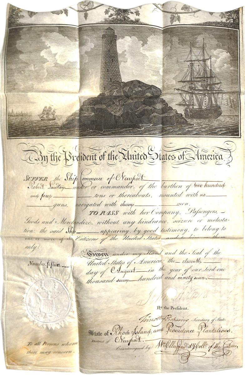 This document is a Mediterranean Passport for the Ship Commerce, issued August 11, 1797, and signed by President John Adams and Secretary of State Timothy Pickering. Mediterranean Passports were special ship passports created after the establishment of a treaty between the United States and Algiers in 1795. This treaty allowed safe passage for American vessels sailing and conducting business in the Mediterranean area in return for tribute paid by the United States.