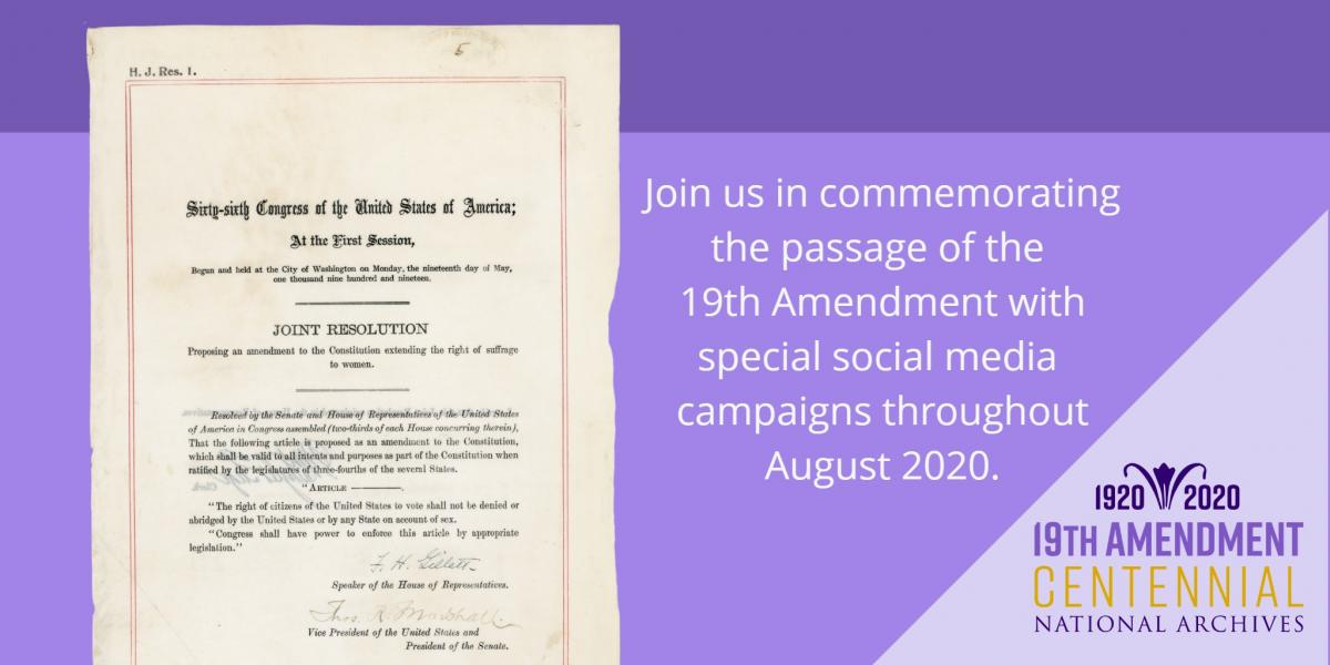 The National Archives is honored to be the home of the 19th Amendment. Join the centennial commemoration on social media as we explore the complex story of the struggle for women’s suffrage, leading up to and beyond the certification of the 19th Amendment on August 26, 1920.