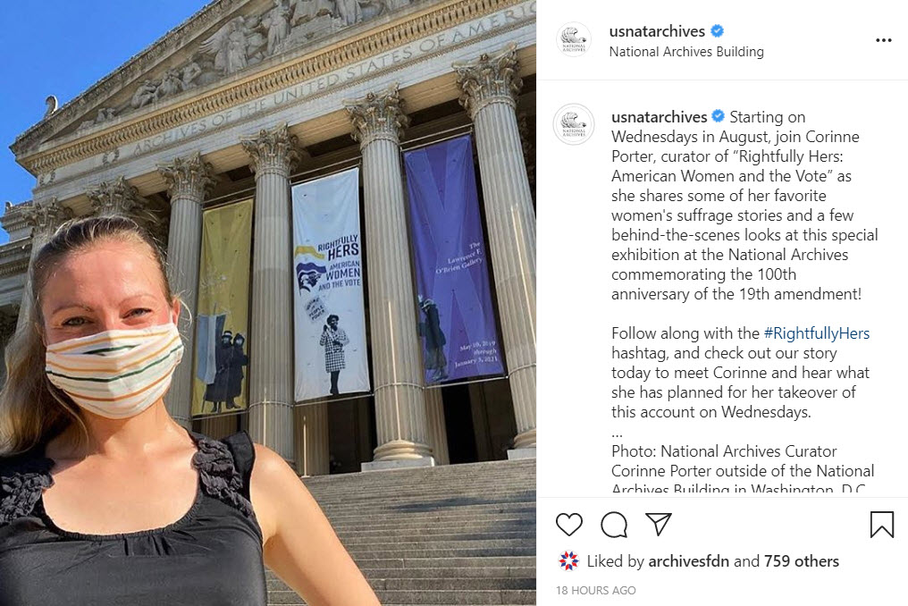 Rightfully Hers Instagram Takeover: Starting on Wednesdays in August, Corinne Porter, curator of "Rightfully Hers: American Women and the Vote," the National Archives' special exhibition to commemorate the 100th anniversary of the 19th amendment, will be taking over the @USNatArchives Instagram account. She will be sharing some of her favorite women's suffrage stories and a few behind-the-scenes looks at the exhibit; you can follow along with the #RightfullyHers hashtag in Instagram stories and posts.