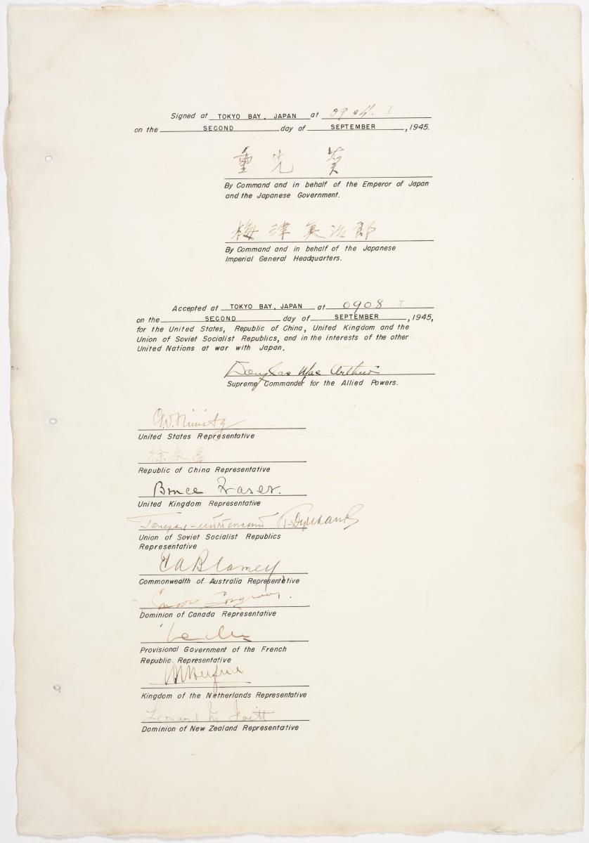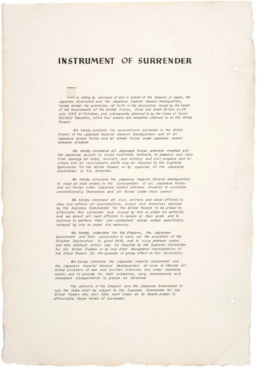 View and download the Japanese Instrument of Surrender in the National Archives Catalog. You can explore more records held in the National Archives at College Park through the National Archives Catalog or by visiting our research room in person. These records are located in Record Group 218: Records of the U.S. Joint Chiefs of Staff, Series: Instruments of Japanese Surrender, September 1945–September 1945.