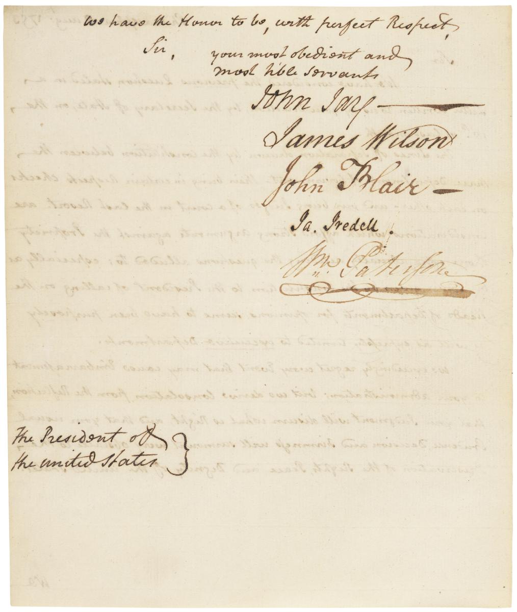 View and download the Letter from Justices of the Supreme Court to President George Washington in the National Archives Catalog. You can explore more records held in the National Archives at College Park through the National Archives Catalog or by visiting our research room in person. These records are located in Record Group 59: Records of the Department of State, Series: Letters Received, 1789–1906.