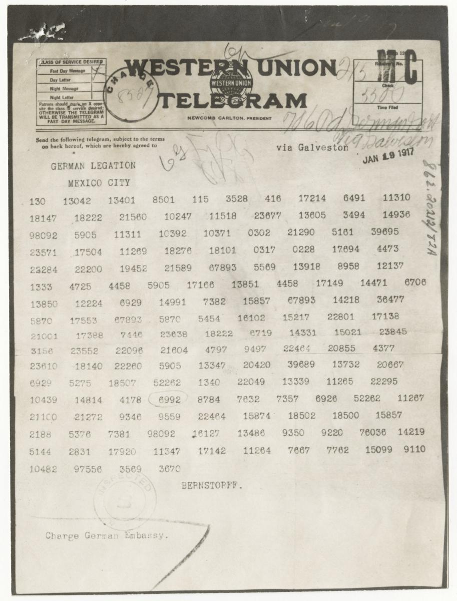 Over two years into the First World War, German Foreign Minister Arthur Zimmerman sent a secret coded telegram to German Minister to Mexico Heinrich von Eckardt. The message offered United States territory to Mexico in return for joining the German cause.